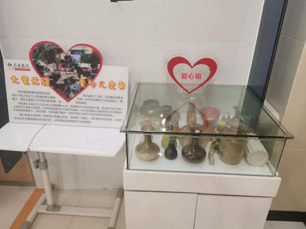 在交行重慶西永支行,“大愛無疆 愛心義賣角”引人注目,形態各異、做工精致的陶藝品陳列其中。