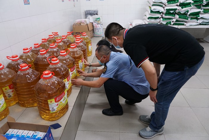 執法人員仔細查看食用油產品信息。夏金梅攝