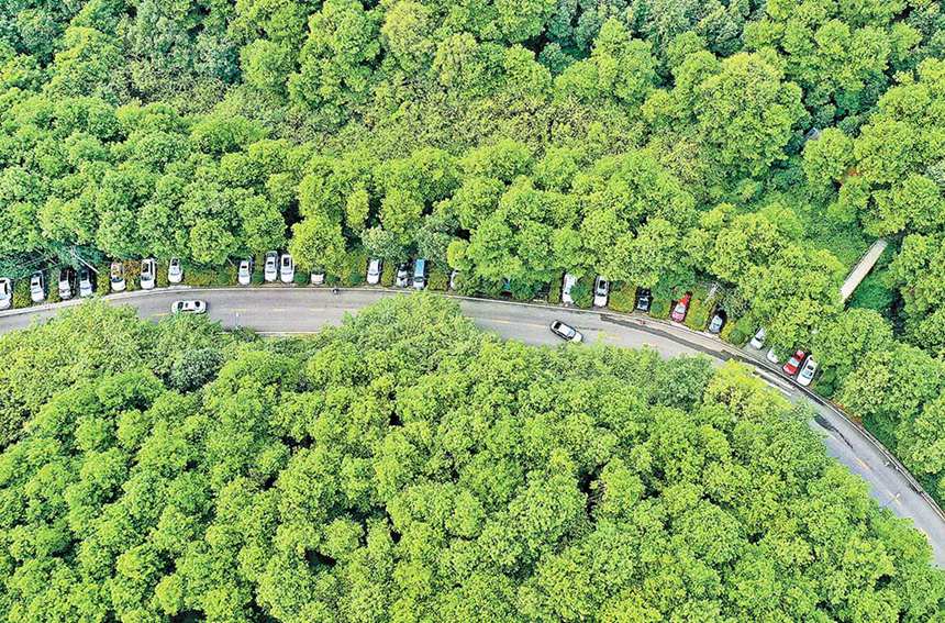 9月12日,江北區鐵山坪森林公園,前來游玩的市民將汽車停在林間的生態停車位上。