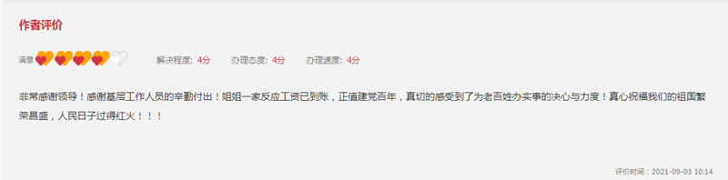家人收到拖欠工資后,9月3日,嚴女士再次給《領導留言板》留言!胺浅8兄x領導!感謝基層工作人員的辛勤付出!姐姐一家拖欠工資已到賬,正值建黨百年,真切的感受到了為老百姓辦實事的決心與力度!真心祝福我們的祖國繁榮昌盛,人民日子過得紅火!”