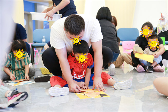 “小蜘蛛俠”和爸爸正在用心構思自己的作品。院方供圖