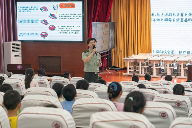 人民網重慶9月18日電 (陳琦)在全國愛牙日前夕,9月18日,西南醫院口腔科主任熊宇為重慶科學城富力南開小學近200名學生帶來了生動的科普課堂。據了解,我國兒童牙齒齲齒發生率約為71%,重慶的情形也差不多,但多數家長對齲齒卻未引起重視。