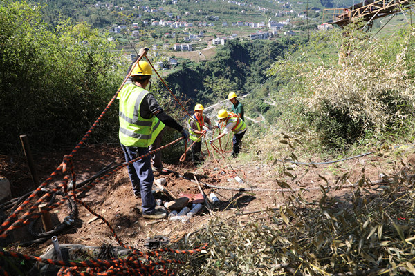 人民網重慶9月21日電 9月20日,中秋假期第二天,在巫溪白鹿鎮七蟒峽危巖崩塌處置施工現場,工人們正在加班作業,進行錨樁固定,架設安全鋼纜,為挖掘機進場作業做準備。
