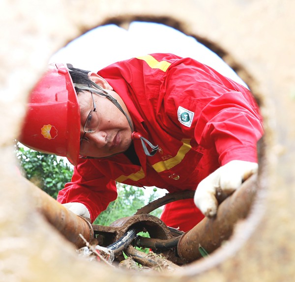 鉆井工程中心二隊技師劉輝在實地了解跟管鉆設備使用情況。劉君攝