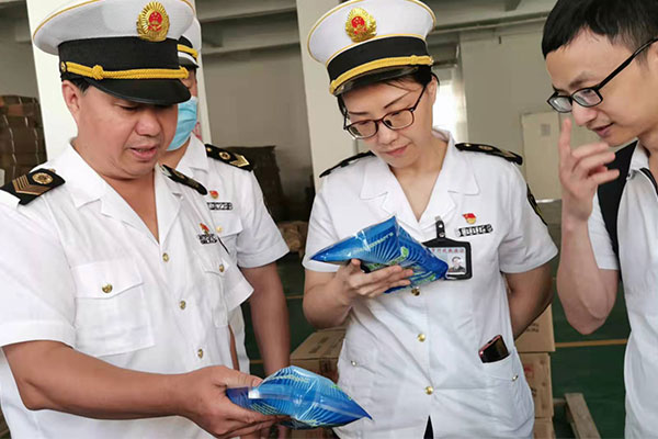 衛生監督員仔細查看產品標識。江津區衛生健康綜合行政執法支隊供圖