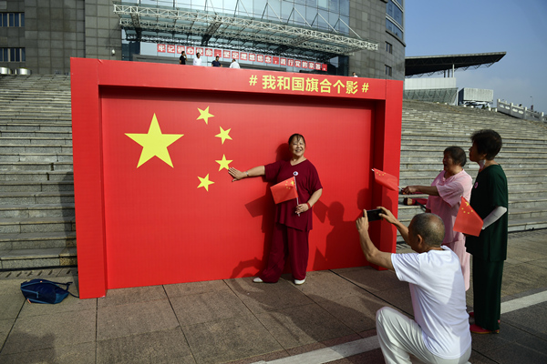 江北的干部群眾紛紛與國旗合影留戀。江北區委宣傳部供圖