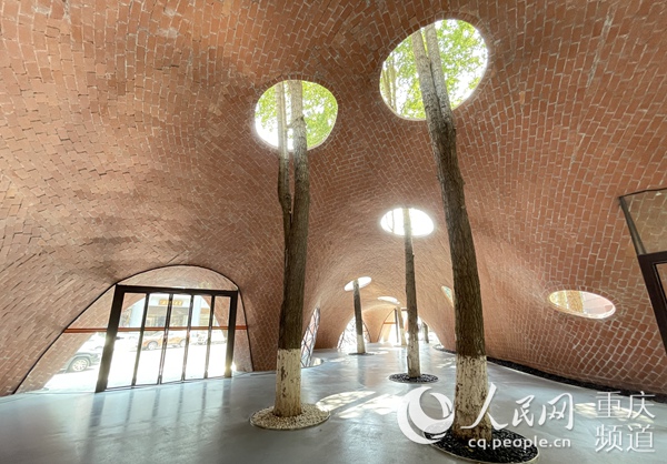 “在設計方面,藝術廊試圖打破院墻固化方式,通過磚拱技術來展現薄殼美學!秉S耘介紹,設計之初,就保留了原場地中的生態樹林,預留了孔洞設置殼體,讓大樹穿洞而出,塑造出與城市交融、輕盈而自由的城市藝術界面。
