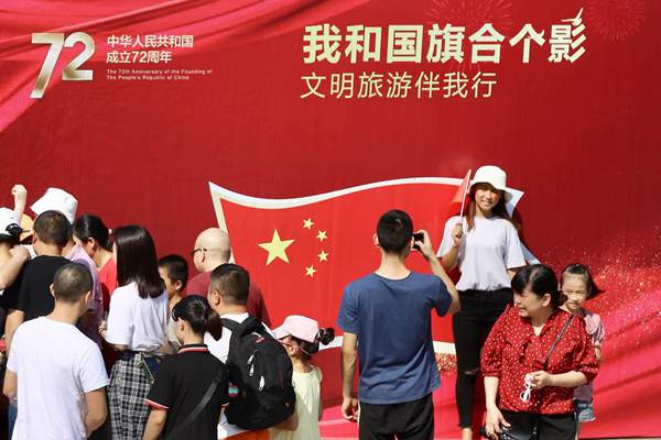 人民網重慶10月2日電 (馮文彥)與國旗合影、吃長壽面……1日,涪陵美心紅酒小鎮景區舉行主題活動,邀請游客一起為新中國慶生,為祖國獻上祝福。當天一早,伴隨悠揚的《歌唱祖國》歌聲響起,紅酒小鎮景區廣場上的游客們手搖國旗,一起歌唱祖國,主題活動由此拉開帷幕。