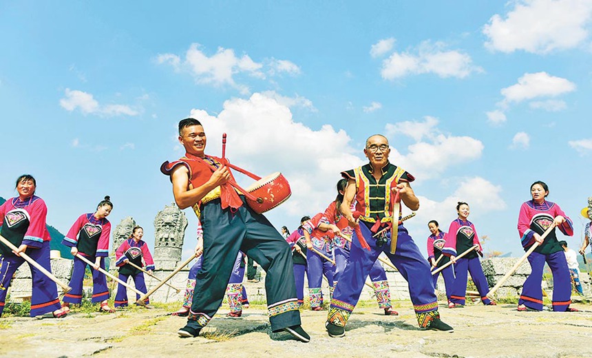 10月2日,在酉陽板溪鎮疊石花谷景區,非遺傳承人為游客展演重慶市級非遺項目“薅草鑼鼓”。通訊員 邱洪斌 攝/視覺重慶