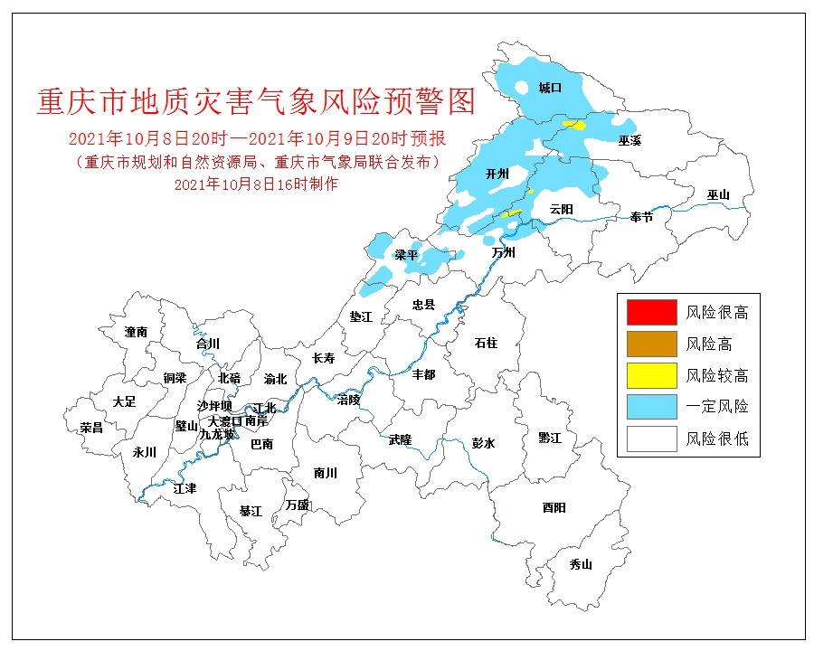 10月8日20時至10月9日20時,開州區、巫溪縣、云陽縣、萬州區屬于風險較高地區,地質災害氣象風險等級為三級(黃色預警),城口縣、奉節縣、墊江縣、梁平區屬于一定風險地區,地質災害氣象風險等級為四級(藍色預警),請相關區縣注意防范。(胡虹、劉敏)