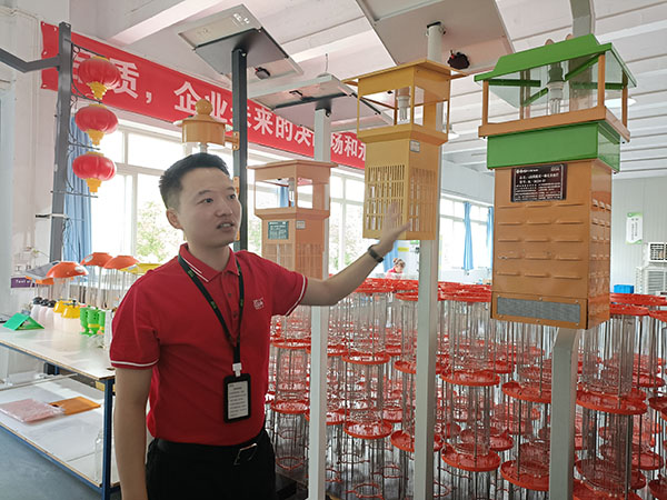 本樂科技負責人介紹公司研制的一體化智能殺蟲燈。李金攝