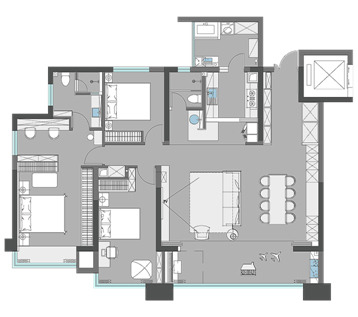 原始戶型三室兩廳、三衛、雙陽臺,戶型方正。業主希望將廚房的采光能夠打造得更好點,并且希望能夠改善次衛和廚房門面向客廳的問題。其次需要將女兒房擴大。因為業主工作的原因,兩人經常會在家辦公,需要一個雙人的辦公區。