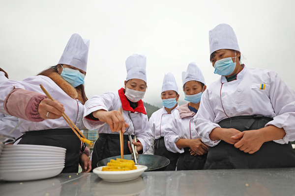 烹飪技術培訓現場,村民們正在練習各種烹飪技巧。趙勇攝