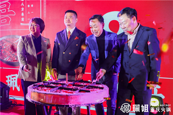 活動現場,珮姐重慶火鍋創始人顏冬生、珮姐重慶火鍋聯合創始人譚偉念、中國烹飪協會副會長兼秘書長佟琳、火鍋委四屆名譽主席湯慶順,一起點燃珮姐八周年火鍋蛋糕慶祝。