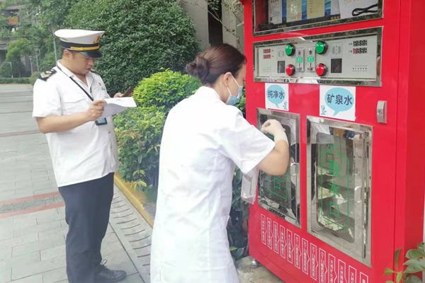 檢查現場,執法人員對現制現售水機的衛生許可批件、標簽、說明書等進行現場核查,對水質的色度、PH值、耗氧量、溶解性總固體等項目進行了檢測。
