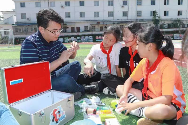 向同學們講解急救箱的使用。浙商銀行重慶分行供圖