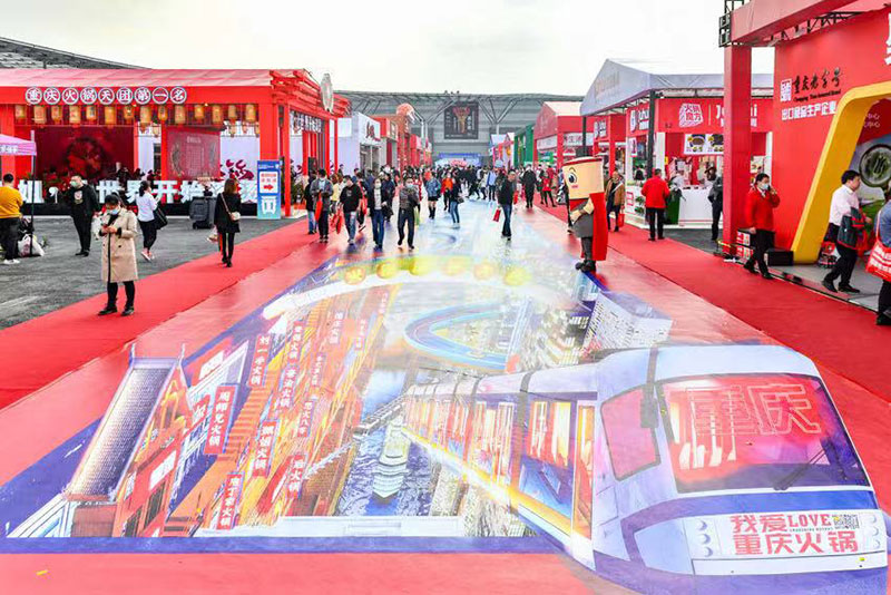 據了解,為體現重慶“中國火鍋之都”的麻辣范兒,悅來國際博覽中心北室外展區被突破性地整體設計包裝成15000㎡ “重慶勒座火鍋城”,復刻了重慶上、下半城城市特色?!爸貞c勒座火鍋城”以“火鍋星光大道”為界,上連集合了全國火鍋品牌的火鍋大觀園,匯聚特色美食的重慶味美食廣場與潮流跨界的火鍋文創天街,下接滿滿年代記憶與煙火氣的萬人火鍋宴。其中,150米8D火鍋星光大道乃西部第一巨幅地畫,300余個重慶火鍋品牌亮相其中,掀起現場打卡風暴。