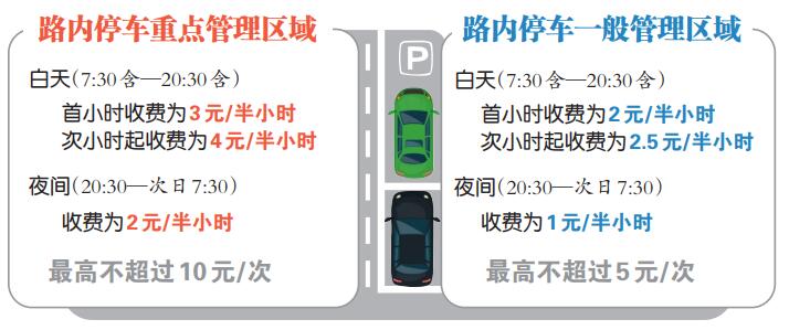 在路內停車重點管理區域,白天(7:30含—20:30含)首小時收費為3.00元/半小時·泊位,次小時起收費為4.00元/半小時·泊位;夜間(20:30—次日7:30)收費為2.00元/半小時·泊位,最高不超過10.00元/次·泊位。
