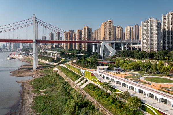 九龍灘以“季節性使用”為設計理念,打造彈性親水空間,形成“九龍外灘,碧岸連天”的美好愿景。九龍灘的設計方案,不僅注重打造山清水秀的生態帶,而且結合地形高差,利用九龍梯、天橋、坡道、下江梯步等設施,將城市腹地與濱江空間進行縫合,構建出從山到城,達岸至水的便捷交通體系。