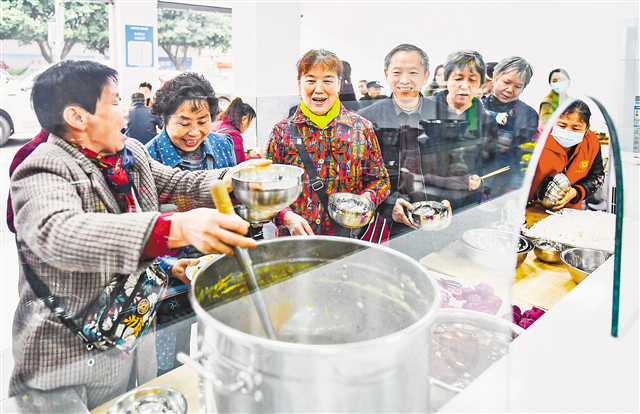 10月27日,江津區幾江街道西關社區“幸福食堂”內,前來用餐的老人排隊打飯菜。據了解,針對轄區內高齡和孤寡老人用餐難問題,西關社區開辦了“幸福食堂”,為他們提供方便、快捷、可口的配餐、就餐服務。