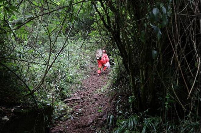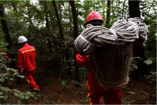鉆井班長袁家強肩背保險繩向工地行進。 西南物探鉆井工程中心供圖