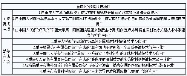 11月3日,國家科學技術獎勵大會在北京舉行。重慶共有9個科技項目獲得2020年度國家科學技術獎,包括國家技術發明獎二等獎3項、國家科技進步獎二等獎6項,其中主持完成的3項,參與完成的6項。
