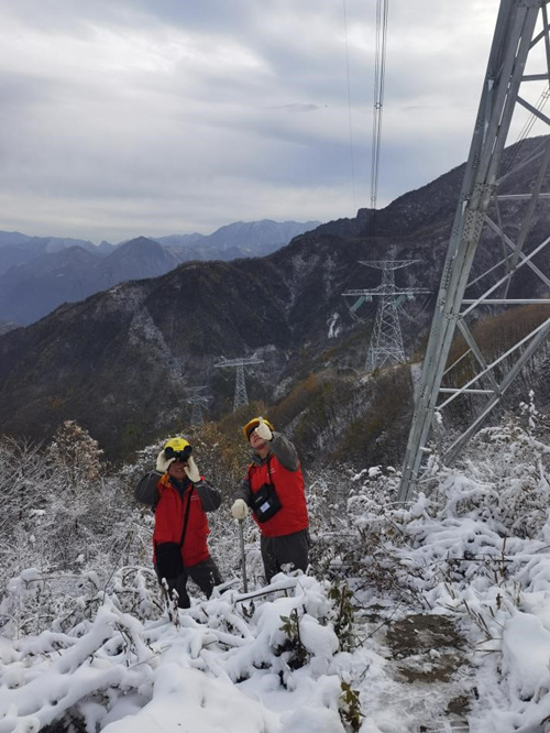在巫溪縣雞心嶺,國網重慶檢修公司輸電運檢一班成員對±800千伏祁韶線開展冰雪天氣特巡。山脊上寒風陣陣,工作環境惡劣,輸電運檢人員腳踏積雪,頂著凜冽的寒風開展線路特巡檢查工作,巡視人員用無人機、望遠鏡、風速儀等設備對線路和觀冰站設施進行檢查和測量,并對線路走廊、導地線、絕緣子串等全面檢查。