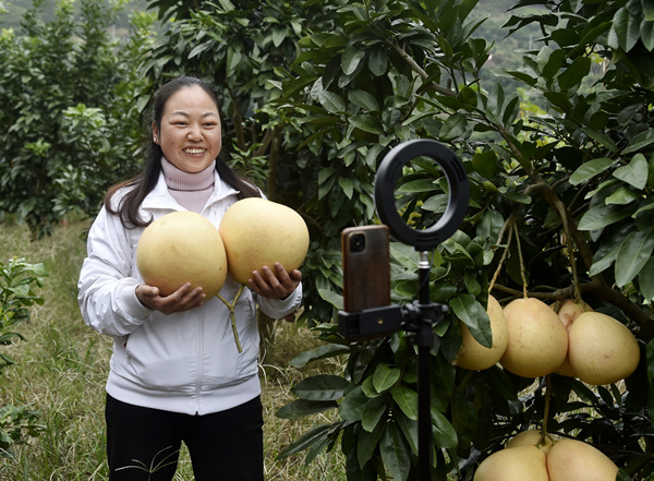 黃興芬為村民直播帶貨,銷售柚子。黃河攝