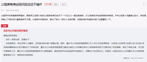 此外,重慶市公共租賃房管理局對北培區蔡家兩江名居小區C區4棟1號電梯故障影響出行的問題也進行了詳細說明,并督促北碚區公共保障住房中心立即開展維修工作,確保電梯盡快完成維修并恢復運行。