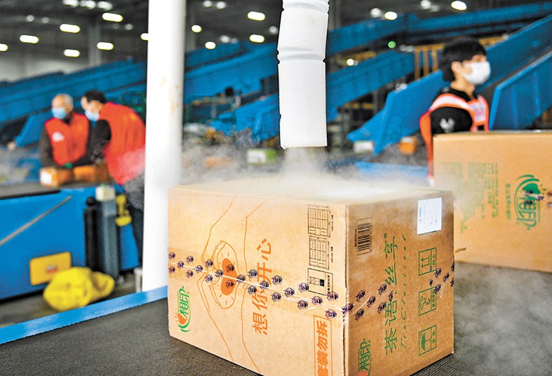 11月13日,在中郵重慶市分公司空港郵件處理中心,入口處的管道噴霧式消殺器在垛口自動對包裹進行消毒。