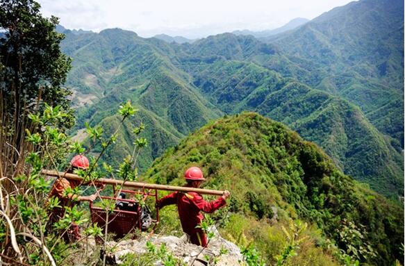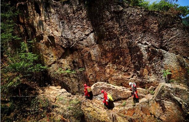 鉆井人員佩戴保險繩在絕壁上運送物資。西南物探分公司鉆井工程中心供圖