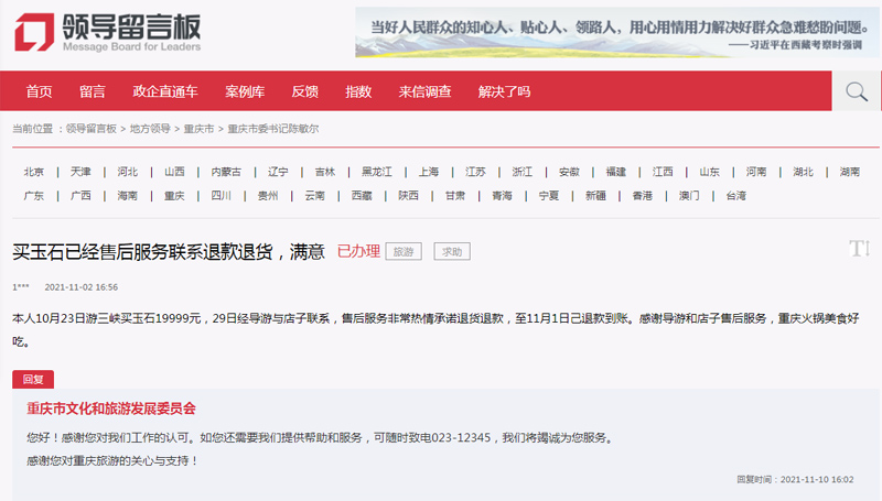 “留言后,重慶市文化和旅游發展委員十分重視,經旅行社導游與店家溝通,售后服務承諾退貨退款。目前,退款已到賬。在此非常感謝,重慶火鍋美食好吃!”11月2日,該網友再次在人民網“領導留言板”留言,專門表示感謝。