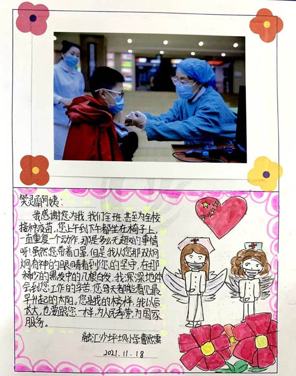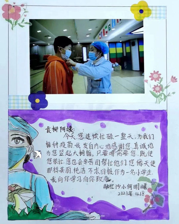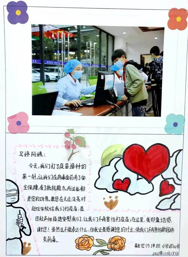 人民網重慶11月20日電 “是您,輕聲細語地安慰我們,讓我們不再害怕;您雖然做著平凡的工作,卻用自己的方式為我們守護了健康……”近日,重慶市沙坪壩區人民醫院的醫護人員走進融匯沙坪壩小學,為孩子們接種新冠病毒滅活疫苗。忙了一天后,孩子們用充滿童趣的的方式表達了心中的愛和感恩。