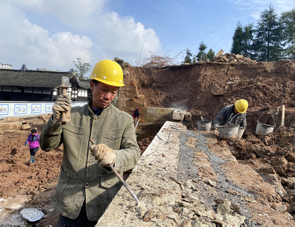 據了解,陳萬寶莊園位于涪陵區青羊鎮,始建于1862年,占地7026平方米,歷經300余工匠,歷時12年建成。整個莊園共有房屋120余間,為“金包銀”穿斗式木結構。在現場,施工人員正在忙著對正廳后壁堡坎進行修復。本次修繕內容主要包括莊園的后壁擋墻、排水系統、梯步、東西天井,以及正廳。
