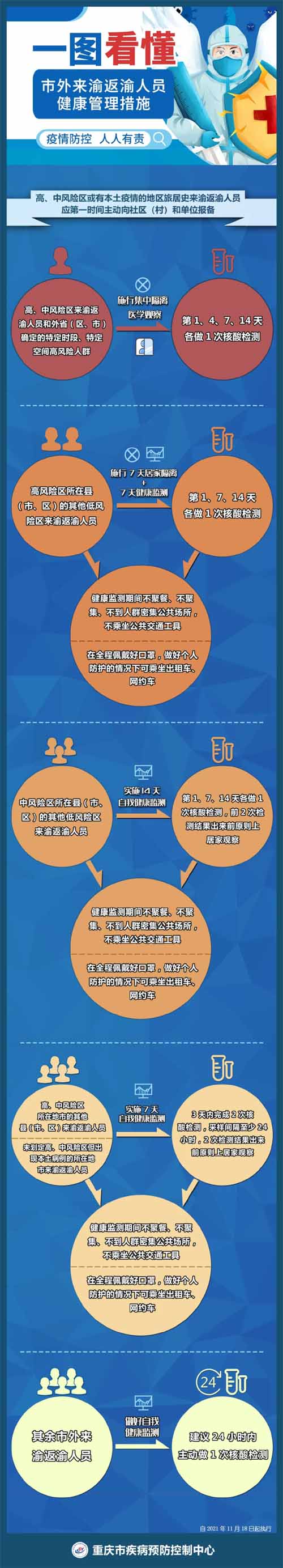 為嚴格落實“外防輸入、內防反彈”的防控策略,按照重慶市疫情防控有關規定,重慶市疾控中心提醒有重點時段和地區旅居史、搭乘過對應時段交通工具的來渝返渝人員,在做好個人防護的前提下,及時向所在地社區(村)、所在單位報告,按要求配合做好核酸檢測、健康監測等各項防控措施。
