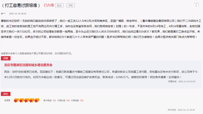 “很滿意”“感謝領導對工作認真負責,非常滿意!”收到工資后,農民工們再次留言表示感謝,并給出“五心”好評。