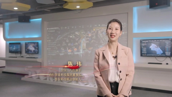 全國三八紅旗手,百行智能科技集團董事長、譽存科技聯合創始人陳瑋進行主旨演講。直播截圖