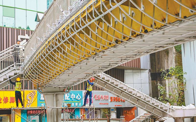 12月14日,渝中區中山一路,工人正在人行天橋安裝支架。