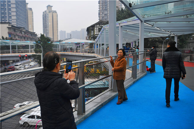 人民網重慶12月16日電 高顏值、有升降電梯、夜晚燈光璀璨……今日,南坪商圈民生工程南坪西路空中聯廊正式投用,不少市民陸續走上新橋進行體驗。