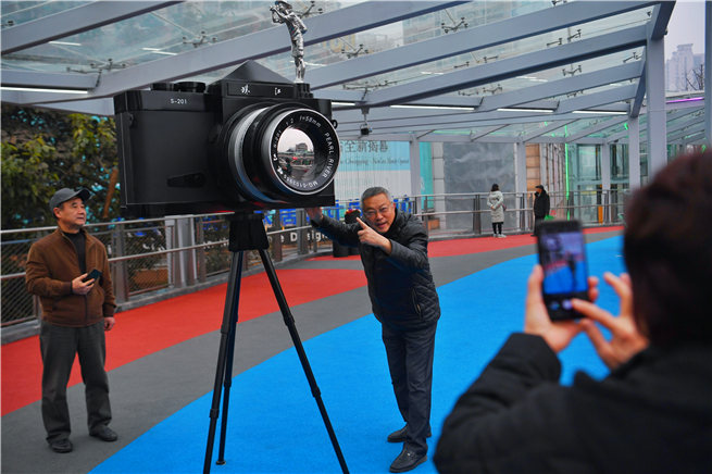 “珠江牌”相機廠區曾位于南坪光電路,聯廊上的雕塑吸引市民打卡。郭旭攝
