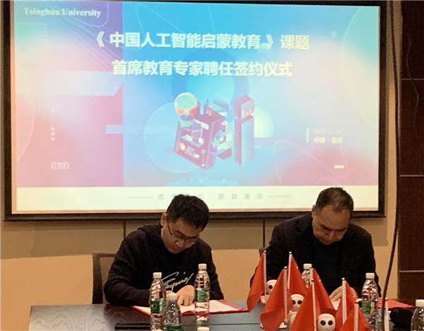 活動現場,清華大學人工智能研究院智能機器人研究中心聘請重慶三峽教育文化研究院院長陳定凡為《幼小兒童人工智能啟蒙教育》課題組組長。