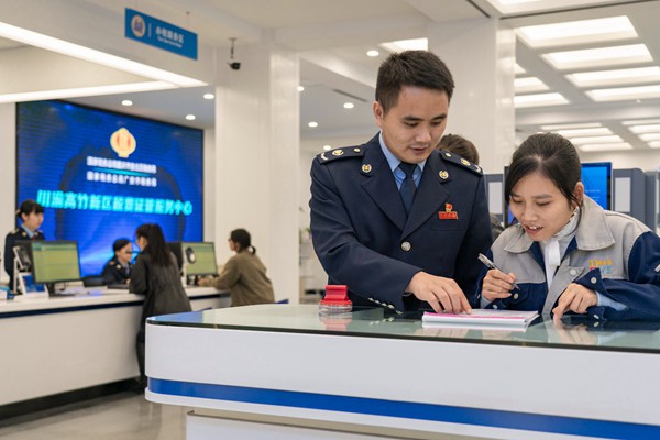 在川渝高竹新區稅費征管服務中心導稅區,稅務人員正輔導辦理涉稅事項。郭睿攝