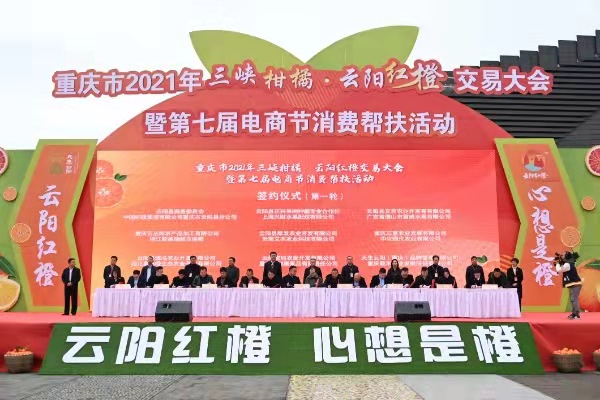 人民網重慶12月17日電 長江碧樹綿延,三峽橘香四溢。17日上午,重慶市2021年三峽柑橘·云陽紅橙交易大會暨第七屆電商節消費幫扶活動在云陽縣開幕。各地柑橘專家、收購客商、電商代表等齊聚云陽,共話柑橘、洽談合作,喜迎豐收。