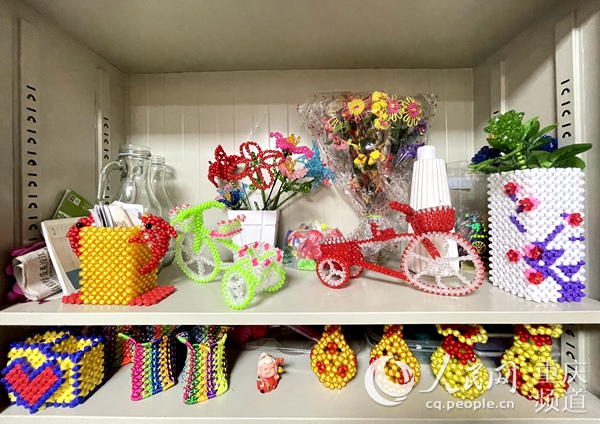 展示架上擺著殘疾人做的串珠手工藝品。人民網 胡虹攝