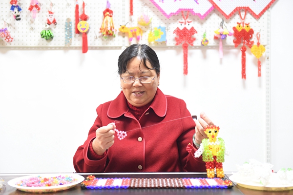 “紅燈籠、小金魚、鑰匙扣、十二生肖……這些都是我們賣得最火的!碧锕鹛m指著墻上掛著的串珠作品,自豪地介紹著,“每次賣完,我們都要趕著再做一批出來!