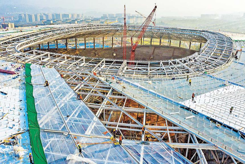 12月21日,重慶龍興足球場施工現場,工人們正在進行金屬屋面及幕墻裝飾施工,為足球場穿上“外衣”。