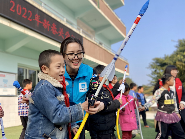 隨后,綦江區青少年活動中心的老師為新建學校的孩子們送去科學技術課程,讓孩子們制作火箭,了解航天科技,滿足孩子們對太空探索的好奇心。