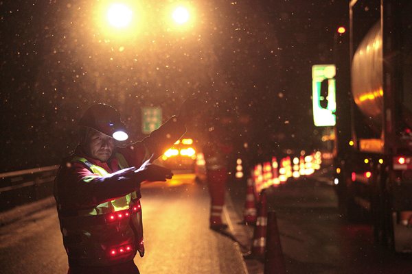 重慶高速集團通力公司養護工人協助高速交巡警進行交通管制。冷文波攝