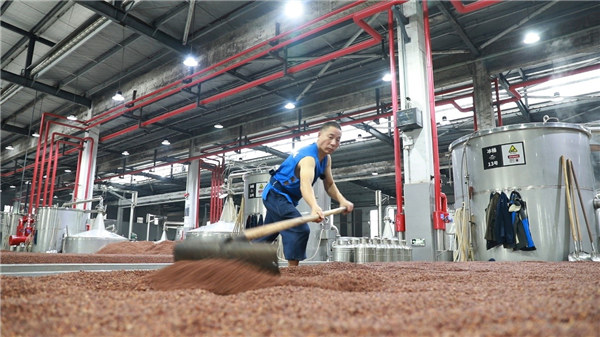 “再有一個多月就要過年放假了,藍師傅可是我們這里的勞模!每年藍師傅都是回家最晚、復工最早的那一批釀酒師,恨不得正月初一就回酒廠來釀酒!币慌粤罆窀吡坏膭煾挡亮瞬令^上的汗,笑著說。盡管正值深冬,但車間里的每一位釀酒師都赤膊在蒸汽里忙碌,身上滲出了連片的汗珠。