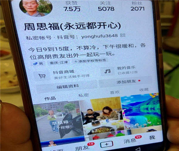 最近,周思福迷上了一個短視頻軟件,閑暇之余他會將日常生活分享在自己的賬號里。拍攝、剪輯、配上歡快的BGM……周思福玩得比許多年輕人還明白,賬號粉絲很快漲到2000多人,獲得了7.5萬的點贊。